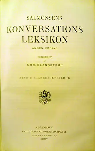 - Salmonsens Konversationsleksikon, 2e édition, sous la direction de Chr. Blangstrup (I-XXI), Johs. Brøndum-Nielsen et Palle Raunkjær (XXII-XXVI), 26 volumes, Copenhague : J. H. Schultz Forlagsboghandel, 1915-1930.