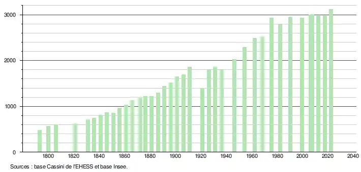 L'évolution du nombre d'habitants est connue à travers les recensements de la population effectués dans la commune depuis 1793. Pour les communes de moins de 10 000 habitants, une enquête de recensement portant sur toute la population est réalisée tous les cinq ans, les populations de référence des années intermédiaires étant quant à elles estimées par interpolation ou extrapolation[41]. Pour la commune, le premier recensement exhaustif entrant dans le cadre du nouveau dispositif a été réalisé en 2007[42].