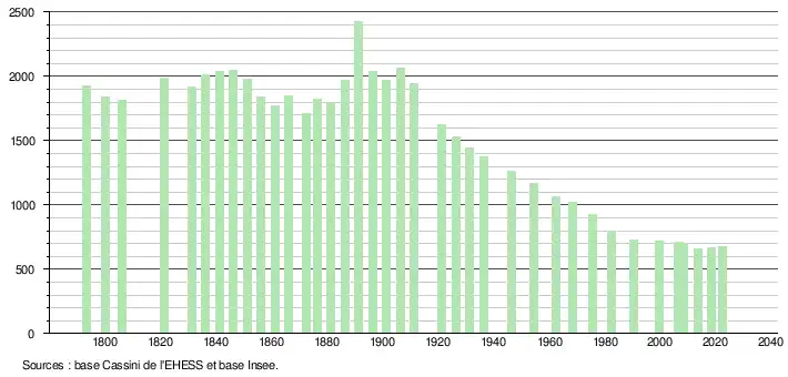 | L'évolution du nombre d'habitants est connue à travers les recensements de la population effectués dans la commune depuis 1793. Pour les communes de moins de 10 000 habitants, une enquête de recensement portant sur toute la population est réalisée tous les cinq ans, les populations de référence des années intermédiaires étant quant à elles estimées par interpolation ou extrapolation[22]. Pour la commune, le premier recensement exhaustif entrant dans le cadre du nouveau dispositif a été réalisé en 2008[23]. En 2022, la commune comptait 679 habitants[Note 2], en évolution de +4,14 % par rapport à 2016 (Corrèze : −0,59 %, France hors Mayotte : +2,11 %). |