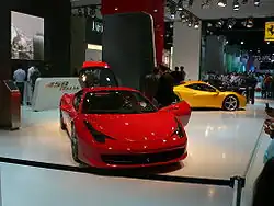 L'apparition d'une nouvelle Ferrari est toujours un événement, d'autant plus lorsque deux d'entre elles, dans des livrées rouge et jaune, sont présentées au Salon de Francfort. Dessinée par le bureau de style du célèbre carrossier Pininfarina, le design de la Ferrari 458 Italia suscite la stupéfaction. Les « traits sont torturés, les angles mêlés d'entrelacs brutalement stoppés »[15] et « les feux surmontés d'une rampe de LED assez petites qui n'offrent pas un regard exceptionnel à l'italienne »[16]. L'une des particularités de cette Ferrari est également son profil ramassé dû à un poste de conduite avancé à l'extrême. Mais même si les critiques envers son dessin sont nombreuses, la 458 Italia attire les foules.