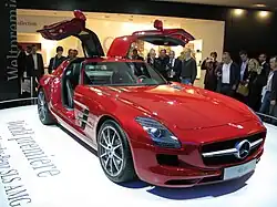 Sur le stand Mercedes-Benz se trouve un modèle évocateur d'un passé glorieux pour la marque allemande : la Mercedes-Benz SLS AMG, hommage à la 300 SL des années 1950.