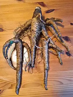 La racine pivotante est charnue, lisse, blanc jaunâtre, longue d'environ 20 cm.