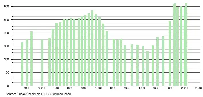 L'évolution du nombre d'habitants est connue à travers les recensements de la population effectués dans la commune depuis 1793. Pour les communes de moins de 10 000 habitants, une enquête de recensement portant sur toute la population est réalisée tous les cinq ans, les populations de référence des années intermédiaires étant quant à elles estimées par interpolation ou extrapolation[14]. Pour la commune, le premier recensement exhaustif entrant dans le cadre du nouveau dispositif a été réalisé en 2005[15].
