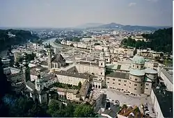 Le centre historique de Salzbourg avec la cathédrale Saint-Rupert de Salzbourg (centre), la forteresse de Hohensalzburg (à droite en arrière) et la Kollegienkirche. | ||||