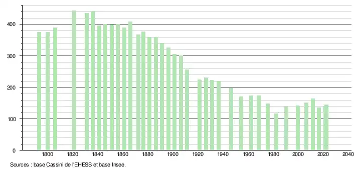 L'évolution du nombre d'habitants est connue à travers les recensements de la population effectués dans la commune depuis 1793. Pour les communes de moins de 10 000 habitants, une enquête de recensement portant sur toute la population est réalisée tous les cinq ans, les populations de référence des années intermédiaires étant quant à elles estimées par interpolation ou extrapolation[27]. Pour la commune, le premier recensement exhaustif entrant dans le cadre du nouveau dispositif a été réalisé en 2006[28].