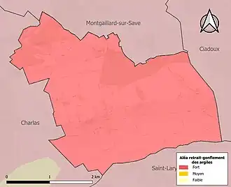 Le retrait-gonflement des sols argileux est susceptible d'engendrer des dommages importants aux bâtiments en cas d’alternance de périodes de sécheresse et de pluie. La totalité de la commune est en aléa moyen ou fort (88,8 % au niveau départemental et 48,5 % au niveau national). Sur les 73 bâtiments dénombrés sur la commune en 2019, 73 sont en aléa moyen ou fort, soit 100 %, à comparer aux 98 % au niveau départemental et 54 % au niveau national. Une cartographie de l'exposition du territoire national au retrait gonflement des sols argileux est disponible sur le site du BRGM[23],[Carte 3].