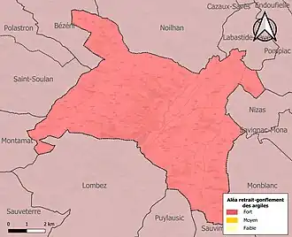 Le retrait-gonflement des sols argileux est susceptible d'engendrer des dommages importants aux bâtiments en cas d’alternance de périodes de sécheresse et de pluie. La totalité de la commune est en aléa moyen ou fort (94,5 % au niveau départemental et 48,5 % au niveau national). Sur les 1 091 bâtiments dénombrés sur la commune en 2019, 1 091 sont en aléa moyen ou fort, soit 100 %, à comparer aux 93 % au niveau départemental et 54 % au niveau national. Une cartographie de l'exposition du territoire national au retrait gonflement des sols argileux est disponible sur le site du BRGM[23],[Carte 3].