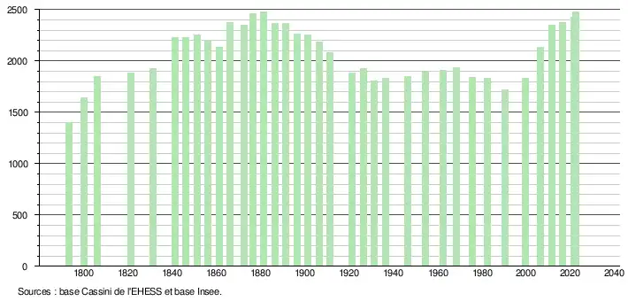 L'évolution du nombre d'habitants est connue à travers les recensements de la population effectués dans la commune depuis 1793. Pour les communes de moins de 10 000 habitants, une enquête de recensement portant sur toute la population est réalisée tous les cinq ans, les populations de référence des années intermédiaires étant quant à elles estimées par interpolation ou extrapolation[31]. Pour la commune, le premier recensement exhaustif entrant dans le cadre du nouveau dispositif a été réalisé en 2006[32].