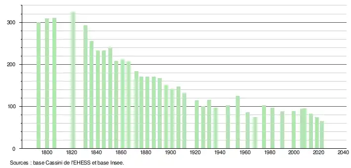 L'évolution du nombre d'habitants est connue à travers les recensements de la population effectués dans la commune depuis 1793. Pour les communes de moins de 10 000 habitants, une enquête de recensement portant sur toute la population est réalisée tous les cinq ans, les populations de référence des années intermédiaires étant quant à elles estimées par interpolation ou extrapolation[14]. Pour la commune, le premier recensement exhaustif entrant dans le cadre du nouveau dispositif a été réalisé en 2008[15].