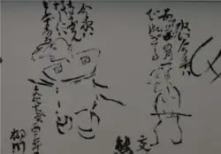Graffiti, dessins de samouraïs et haïku, mur du temple Iida-san Jorakuji (Mashiki, préfecture de Kumamoto); première moitié du 19e s.
