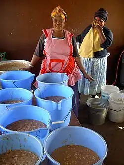 Les grains de maïs non cassés ni décortiqués peuvent également être cuits (bouillis) jusqu'à devenir tendres. Ce plat est alors appelé stampmielies en afrikaans.