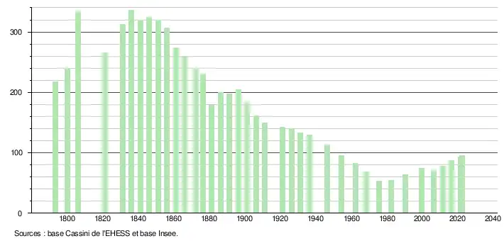 L'évolution du nombre d'habitants est connue à travers les recensements de la population effectués dans la commune depuis 1793. Pour les communes de moins de 10 000 habitants, une enquête de recensement portant sur toute la population est réalisée tous les cinq ans, les populations de référence des années intermédiaires étant quant à elles estimées par interpolation ou extrapolation[43]. Pour la commune, le premier recensement exhaustif entrant dans le cadre du nouveau dispositif a été réalisé en 2006[44].
