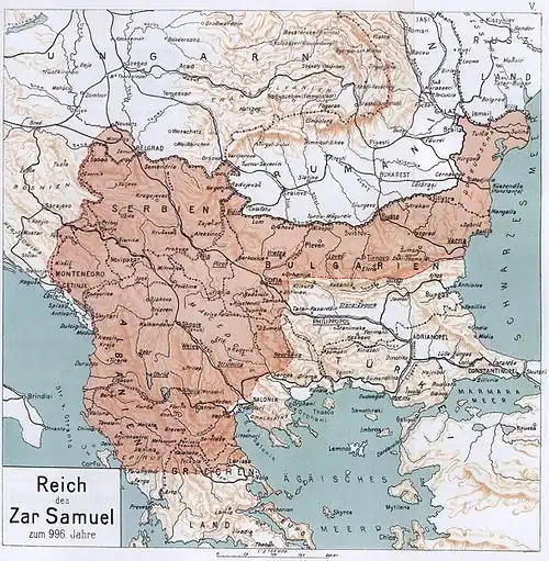 C'est à cette époque que Samuel, ayant remporté la victoire à la bataille de Thessalonique et estimant avoir rétabli la Bulgarie dans l'étendue qu'elle avait du temps du tsar Siméon, se proclame basileus , en 997, après la mort de Roman de Bulgarie. Il est un temps considéré comme invincible même par les Byzantins ; jouant sur le nom « Cometopoulos », le poète Jean Géomètre le compare à une comète apparue en 989.