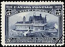 Champlain construisant son Habitation, par Charles William Jefferys, 1925.Timbre-poste commémoratif, représentant l'Habitation de Québec, 1908.