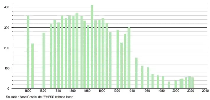 L'évolution du nombre d'habitants est connue à travers les recensements de la population effectués dans la commune depuis 1800. Pour les communes de moins de 10 000 habitants, une enquête de recensement portant sur toute la population est réalisée tous les cinq ans, les populations de référence des années intermédiaires étant quant à elles estimées par interpolation ou extrapolation[6]. Pour la commune, le premier recensement exhaustif entrant dans le cadre du nouveau dispositif a été réalisé en 2008[7].