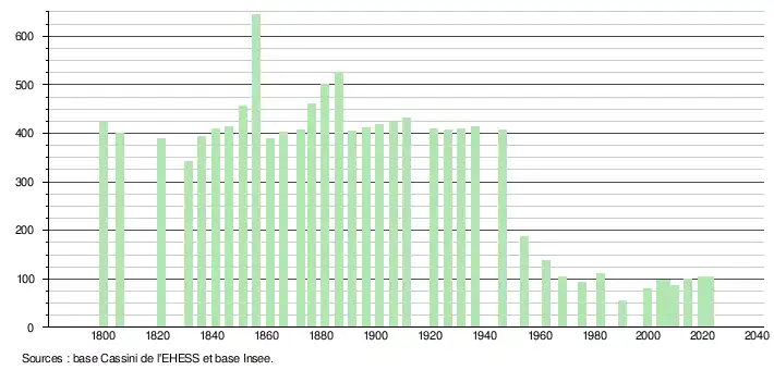 L'évolution du nombre d'habitants est connue à travers les recensements de la population effectués dans la commune depuis 1800. Pour les communes de moins de 10 000 habitants, une enquête de recensement portant sur toute la population est réalisée tous les cinq ans, les populations de référence des années intermédiaires étant quant à elles estimées par interpolation ou extrapolation[6]. Pour la commune, le premier recensement exhaustif entrant dans le cadre du nouveau dispositif a été réalisé en 2004[7].