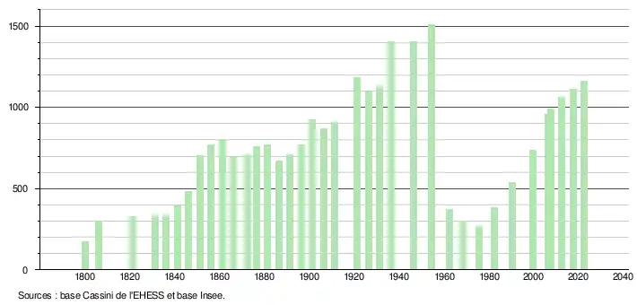 L'évolution du nombre d'habitants est connue à travers les recensements de la population effectués dans la commune depuis 1800. Pour les communes de moins de 10 000 habitants, une enquête de recensement portant sur toute la population est réalisée tous les cinq ans, les populations de référence des années intermédiaires étant quant à elles estimées par interpolation ou extrapolation[18]. Pour la commune, le premier recensement exhaustif entrant dans le cadre du nouveau dispositif a été réalisé en 2007[19].