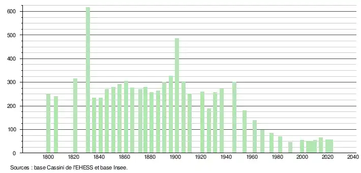 L'évolution du nombre d'habitants est connue à travers les recensements de la population effectués dans la commune depuis 1800. Pour les communes de moins de 10 000 habitants, une enquête de recensement portant sur toute la population est réalisée tous les cinq ans, les populations de référence des années intermédiaires étant quant à elles estimées par interpolation ou extrapolation[17]. Pour la commune, le premier recensement exhaustif entrant dans le cadre du nouveau dispositif a été réalisé en 2004[18].