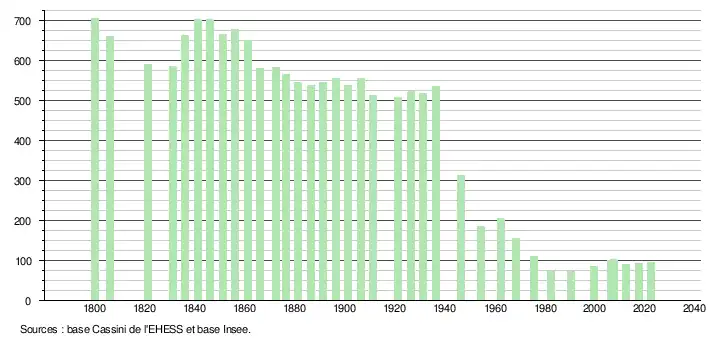 L'évolution du nombre d'habitants est connue à travers les recensements de la population effectués dans la commune depuis 1800. Pour les communes de moins de 10 000 habitants, une enquête de recensement portant sur toute la population est réalisée tous les cinq ans, les populations de référence des années intermédiaires étant quant à elles estimées par interpolation ou extrapolation[6]. Pour la commune, le premier recensement exhaustif entrant dans le cadre du nouveau dispositif a été réalisé en 2007[7].