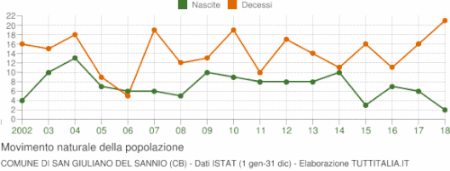 - 1 2 3 (it) « Popolazione San Giuliano del Sannio (2001-2018) Grafici su dati ISTAT », sur Tuttitalia.it (consulté le )