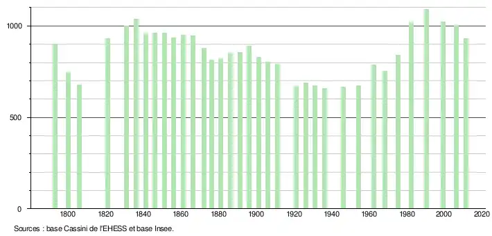 L'évolution du nombre d'habitants est connue à travers les recensements de la population effectués dans la commune depuis 1793. À partir du , les populations légales des communes sont publiées annuellement dans le cadre d'un recensement qui repose désormais sur une collecte d'information annuelle, concernant successivement tous les territoires communaux au cours d'une période de cinq ans. Pour les communes de moins de 10 000 habitants, une enquête de recensement portant sur toute la population est réalisée tous les cinq ans, les populations légales des années intermédiaires étant quant à elles estimées par interpolation ou extrapolation[4]. Pour la commune, le premier recensement exhaustif entrant dans le cadre du nouveau dispositif a été réalisé en 2006[5],[Note 1].