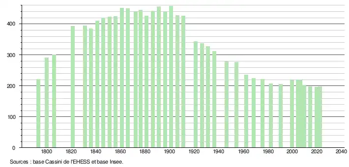 L'évolution du nombre d'habitants est connue à travers les recensements de la population effectués dans la commune depuis 1793. Pour les communes de moins de 10 000 habitants, une enquête de recensement portant sur toute la population est réalisée tous les cinq ans, les populations de référence des années intermédiaires étant quant à elles estimées par interpolation ou extrapolation[22]. Pour la commune, le premier recensement exhaustif entrant dans le cadre du nouveau dispositif a été réalisé en 2004[23].
