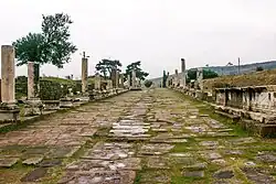Le site archéologique conserve un théâtre romain, des portiques (stoa nord et sud), le temple d'Asclépios, ainsi qu'un centre de traitement, de plan circulaire, parfois appelé temple de Télesphore.