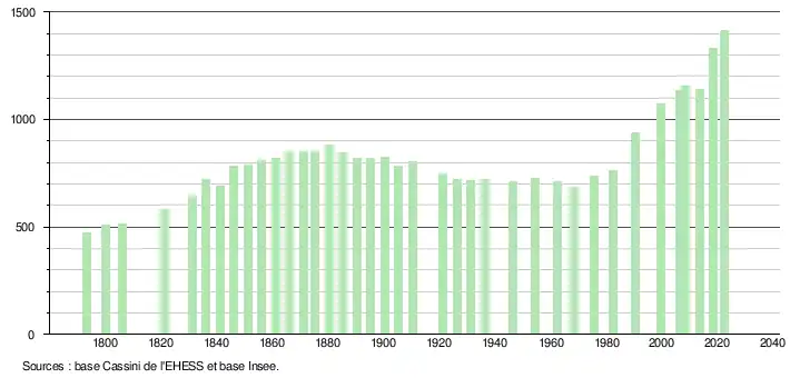 L'évolution du nombre d'habitants est connue à travers les recensements de la population effectués dans la commune depuis 1793. Pour les communes de moins de 10 000 habitants, une enquête de recensement portant sur toute la population est réalisée tous les cinq ans, les populations de référence des années intermédiaires étant quant à elles estimées par interpolation ou extrapolation[25]. Pour la commune, le premier recensement exhaustif entrant dans le cadre du nouveau dispositif a été réalisé en 2008[26].
