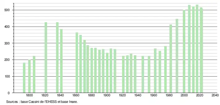 L'évolution du nombre d'habitants est connue à travers les recensements de la population effectués dans la commune depuis 1793. Pour les communes de moins de 10 000 habitants, une enquête de recensement portant sur toute la population est réalisée tous les cinq ans, les populations de référence des années intermédiaires étant quant à elles estimées par interpolation ou extrapolation[16]. Pour la commune, le premier recensement exhaustif entrant dans le cadre du nouveau dispositif a été réalisé en 2006[17].