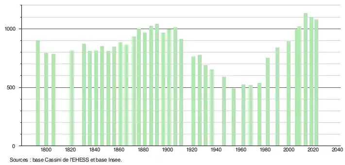 L'évolution du nombre d'habitants est connue à travers les recensements de la population effectués dans la commune depuis 1793. Pour les communes de moins de 10 000 habitants, une enquête de recensement portant sur toute la population est réalisée tous les cinq ans, les populations de référence des années intermédiaires étant quant à elles estimées par interpolation ou extrapolation[24]. Pour la commune, le premier recensement exhaustif entrant dans le cadre du nouveau dispositif a été réalisé en 2008[25].