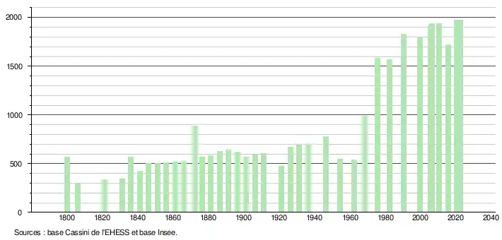 L'évolution du nombre d'habitants est connue à travers les recensements de la population effectués dans la commune depuis 1800. Pour les communes de moins de 10 000 habitants, une enquête de recensement portant sur toute la population est réalisée tous les cinq ans, les populations de référence des années intermédiaires étant quant à elles estimées par interpolation ou extrapolation[19]. Pour la commune, le premier recensement exhaustif entrant dans le cadre du nouveau dispositif a été réalisé en 2005[20].
