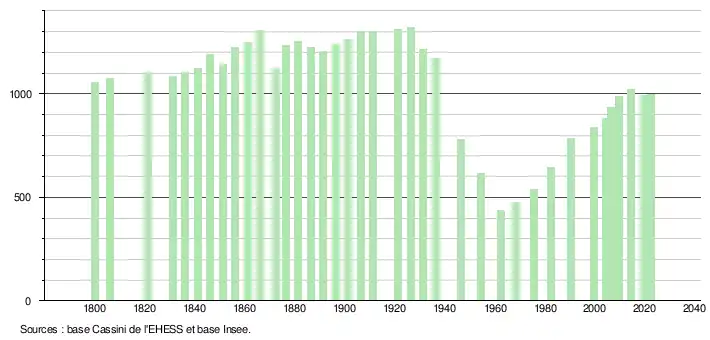 L'évolution du nombre d'habitants est connue à travers les recensements de la population effectués dans la commune depuis 1800. Pour les communes de moins de 10 000 habitants, une enquête de recensement portant sur toute la population est réalisée tous les cinq ans, les populations de référence des années intermédiaires étant quant à elles estimées par interpolation ou extrapolation[13]. Pour la commune, le premier recensement exhaustif entrant dans le cadre du nouveau dispositif a été réalisé en 2004[14].