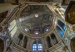 L'église est divisée en un volume cubique de plan carré, sur lequel reposent une coupole octogonale et quatre petits clochers aux angles. A l'intérieur, l'espace plan central est généré par les huit côtés du dôme projetés dans le périmètre carré de l'église ; la figure ainsi inscrite crée une succession de niches pour chacune des faces de l'octogone. La façade est inachevée et est plâtrée dans la partie inférieure. Dans la partie sud, il y a une décoration très particulière de formes circulaires tangentes les unes aux autres, entourées d'un cadre en terre cuite. La décoration intérieure a été réalisée au début du XVIIe siècle par d'importants peintres de l'école baroque. La salle centrale a une forme carrée, sur laquelle une division octogonale est insérée dans la partie supérieure qui suit celle du dôme[1]. Le presbytère a été construit à partir de 1564. Dans les voiles dans lesquelles est fixée la deuxième coupole qui couvre l'autel principal, huit sibylles disposées par paires, peintes par Guglielmo Caccia, sont représentées. A côté du presbytère se trouvent deux chapelles. A gauche la chapelle du Crucifix qui abrite, dans une niche du mur est, l'ensemble en bois du Crucifix apporté en dot par la confrérie de Saint Sébastien. Sur le mur nord, il y a la toile de la Résurrection de Pietro Maggi, et sur le mur ouest une autre toile avec l'Assomption de la Vierge. A droite du presbytère se trouve la chapelle de l'Immaculée Conception. Sur le mur est se trouve la toile avec L'Immaculée Conception de Bernardino Ciceri. Ci-contre, en revanche, la toile avec le Couronnement de la Vierge. Dans l'épais mur qui sépare la salle du presbytère, en deux petites pièces, sont placées : à gauche la toile représentant saint Charles Borromée en robe d'évêque à droite, devant, la toile avec saint Alexandre Sauli, les deux toiles ont été faites par Guglielmo Caccia en 1614[2].