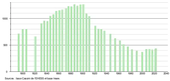 L'évolution du nombre d'habitants est connue à travers les recensements de la population effectués dans la commune depuis 1793. Pour les communes de moins de 10 000 habitants, une enquête de recensement portant sur toute la population est réalisée tous les cinq ans, les populations de référence des années intermédiaires étant quant à elles estimées par interpolation ou extrapolation[20]. Pour la commune, le premier recensement exhaustif entrant dans le cadre du nouveau dispositif a été réalisé en 2006[21].