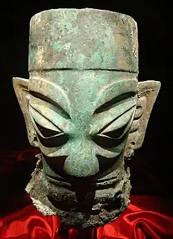 - un masque en bronze aux yeux saillants (évoquant pour certains Can Cong, ancêtre des Shu),