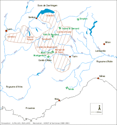 Les limites de la Sapaudie, bien que difficiles à tracer, semblent être redéfinies lors de la succession de Charlemagne et correspondre dorénavant au territoire compris entre le Mâconnais et le Lyonnais à l'ouest (perdant l'évêché d'Avenches) et la Tarentaise et la Maurienne à l'Est et au Sud[11]. Elle comprend désormais, outre le futur comté de Savoie, l'évêché de Belley, le Bugey septentrional, le Valromey et peut être le Chablais. L'absence de sources ne permet pas de dire à qui revenait ce territoire avant le Xe siècle, simplement que s'érigent un certain nombre de comtés sur les pagus, notamment autour des villes de Genève, Grenoble et Belley. Les quelques certitudes sont qu'aux environs de 880, la partie nord de cette contrée appartenait au royaume de haute-Bourgogne et le sud au royaume de Provence qui deviendra le Royaume d'Arles en 933[12], mais là encore, le partage est incertain.