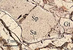 La saphirine a également été identifiée comme le produit d'une réaction (avec le grenat) entre le spinelle Mg-Al et le clinopyroxène riche en Ca-Tschermak dans les pyroxénites du manteau contenant du corindon[10],[11].