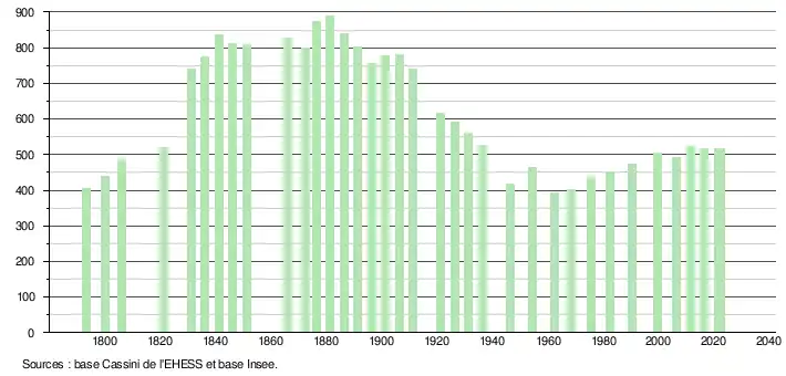 L'évolution du nombre d'habitants est connue à travers les recensements de la population effectués dans la commune depuis 1793. Pour les communes de moins de 10 000 habitants, une enquête de recensement portant sur toute la population est réalisée tous les cinq ans, les populations de référence des années intermédiaires étant quant à elles estimées par interpolation ou extrapolation[26]. Pour la commune, le premier recensement exhaustif entrant dans le cadre du nouveau dispositif a été réalisé en 2006[27].