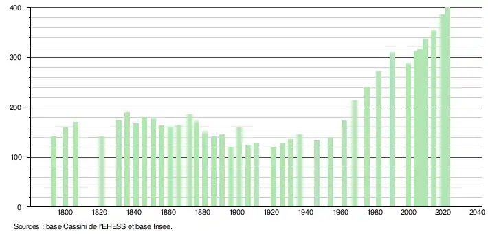 L'évolution du nombre d'habitants est connue à travers les recensements de la population effectués dans la commune depuis 1793. Pour les communes de moins de 10 000 habitants, une enquête de recensement portant sur toute la population est réalisée tous les cinq ans, les populations de référence des années intermédiaires étant quant à elles estimées par interpolation ou extrapolation[15]. Pour la commune, le premier recensement exhaustif entrant dans le cadre du nouveau dispositif a été réalisé en 2004[16].