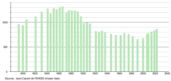 | L'évolution du nombre d'habitants est connue à travers les recensements de la population effectués dans la commune depuis 1793. Pour les communes de moins de 10 000 habitants, une enquête de recensement portant sur toute la population est réalisée tous les cinq ans, les populations de référence des années intermédiaires étant quant à elles estimées par interpolation ou extrapolation[26]. Pour la commune, le premier recensement exhaustif entrant dans le cadre du nouveau dispositif a été réalisé en 2008[27]. En 2022, la commune comptait 863 habitants[Note 5], en évolution de +5,63 % par rapport à 2016 (Gers : +1,04 %, France hors Mayotte : +2,11 %). |