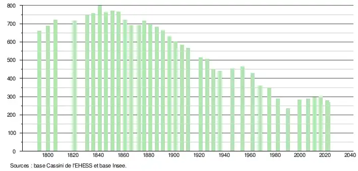 L'évolution du nombre d'habitants est connue à travers les recensements de la population effectués dans la commune depuis 1793. Pour les communes de moins de 10 000 habitants, une enquête de recensement portant sur toute la population est réalisée tous les cinq ans, les populations de référence des années intermédiaires étant quant à elles estimées par interpolation ou extrapolation[14]. Pour la commune, le premier recensement exhaustif entrant dans le cadre du nouveau dispositif a été réalisé en 2006[15].