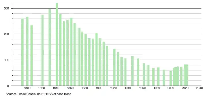 L'évolution du nombre d'habitants est connue à travers les recensements de la population effectués dans la commune depuis 1793. Pour les communes de moins de 10 000 habitants, une enquête de recensement portant sur toute la population est réalisée tous les cinq ans, les populations de référence des années intermédiaires étant quant à elles estimées par interpolation ou extrapolation[26]. Pour la commune, le premier recensement exhaustif entrant dans le cadre du nouveau dispositif a été réalisé en 2004[27].