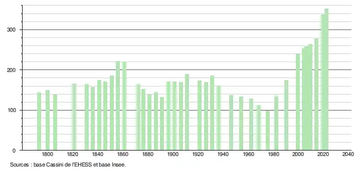 L'évolution du nombre d'habitants est connue à travers les recensements de la population effectués dans la commune depuis 1793. Pour les communes de moins de 10 000 habitants, une enquête de recensement portant sur toute la population est réalisée tous les cinq ans, les populations de référence des années intermédiaires étant quant à elles estimées par interpolation ou extrapolation[18]. Pour la commune, le premier recensement exhaustif entrant dans le cadre du nouveau dispositif a été réalisé en 2004[19].