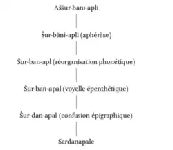 Concernant Sardanapale, une possible confusion homonymique, avec un satrape cilicien, pourrait être à l'origine de son nom. Une dérivation à partir du nom sémitique du souverain est toutefois plus probable, les principales règles de passages d'une langue à l'autre se retrouvant dans les Græco-Babyloniaca[1], et plus particulièrement, pour notre cas présent, dans l'Inscription de Çineköy. Cette dernière atteste en effet de l'aphérèse touchant le mot aššurû (Assyrie), donnant ainsi le mot à l'origine de Syrie, et expliquant la disparition du premier segment vocalique d'Aššur-bāni-apli, donnant Sur-. Une réorganisation phonétique expliquerait ensuite l'altération des timbres vocaliques du nom akkadien, les /i/ ne se prononçant plus. L'apparition d'une nécessaire voyelle épenthètique achève la vocalisation obtenue pour Sardanapale. Enfin, le passage du b- au d-, s'explique du côté de l'épigraphie grecque, dans la confusion des deux lettres par le lapicide[b].