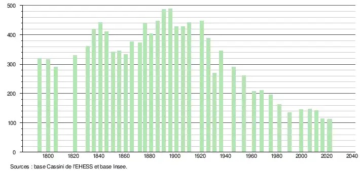L'évolution du nombre d'habitants est connue à travers les recensements de la population effectués dans la commune depuis 1793. Pour les communes de moins de 10 000 habitants, une enquête de recensement portant sur toute la population est réalisée tous les cinq ans, les populations de référence des années intermédiaires étant quant à elles estimées par interpolation ou extrapolation[13]. Pour la commune, le premier recensement exhaustif entrant dans le cadre du nouveau dispositif a été réalisé en 2006[14].