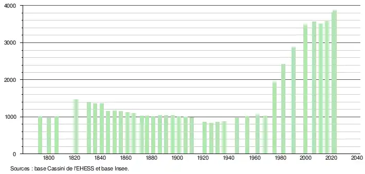L'évolution du nombre d'habitants est connue à travers les recensements de la population effectués dans la commune depuis 1793. Pour les communes de moins de 10 000 habitants, une enquête de recensement portant sur toute la population est réalisée tous les cinq ans, les populations de référence des années intermédiaires étant quant à elles estimées par interpolation ou extrapolation[21]. Pour la commune, le premier recensement exhaustif entrant dans le cadre du nouveau dispositif a été réalisé en 2006[22].