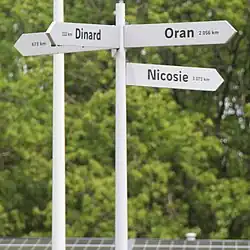 Panneau indicateur multidirectionnel sur l'aire d'autoroute de Sargé.
