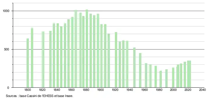 L'évolution du nombre d'habitants est connue à travers les recensements de la population effectués dans la commune depuis 1800. Pour les communes de moins de 10 000 habitants, une enquête de recensement portant sur toute la population est réalisée tous les cinq ans, les populations de référence des années intermédiaires étant quant à elles estimées par interpolation ou extrapolation[7]. Pour la commune, le premier recensement exhaustif entrant dans le cadre du nouveau dispositif a été réalisé en 2005[8].