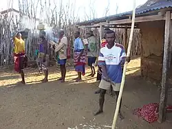 Les garçons de la famille habillés d'un paréo (lambahoany) quittent le village pour annoncer la mort de leurs proches dans la campagne environnante. Le défunt restera dans son lit de mort pendant 2 jours, toutes ses connaissances viendront lui rendre hommage et participer à la cérémonie d'adieu. Le lendemain, il sera mis en cercueil et conduit au tombeau familial à quelques centaines de mètres de son domicile. Là un dernier bœuf rendra son âme et sera partagé à tout le monde.