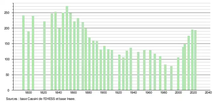 L'évolution du nombre d'habitants est connue à travers les recensements de la population effectués dans la commune depuis 1793. Pour les communes de moins de 10 000 habitants, une enquête de recensement portant sur toute la population est réalisée tous les cinq ans, les populations de référence des années intermédiaires étant quant à elles estimées par interpolation ou extrapolation[16]. Pour la commune, le premier recensement exhaustif entrant dans le cadre du nouveau dispositif a été réalisé en 2008[17].